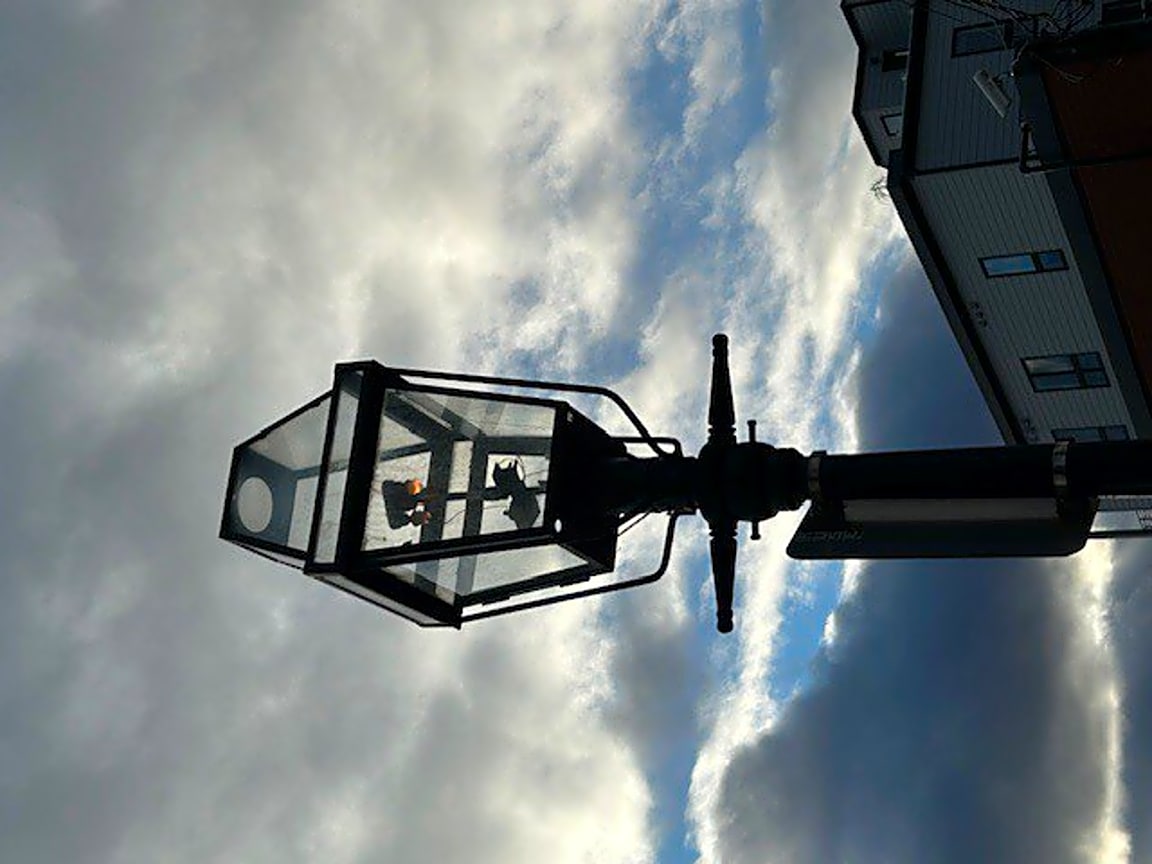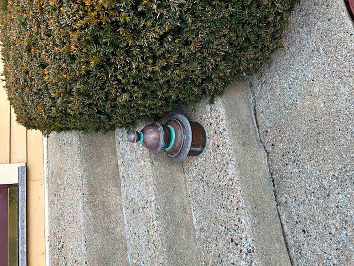 Intersection Of Enterprise St And Boston St, Dorchester, MaThe wind blew this top off this lamp. It's on Enterprise St. on the corner of Boston St. in Dorchester, there are about 10 is these lamps around the houses the Dorchester Historical Society. When you come to put it back you'll find it behind the yew bush, in front of the side entrance to the Lemuel Clap, on Enterprise St.