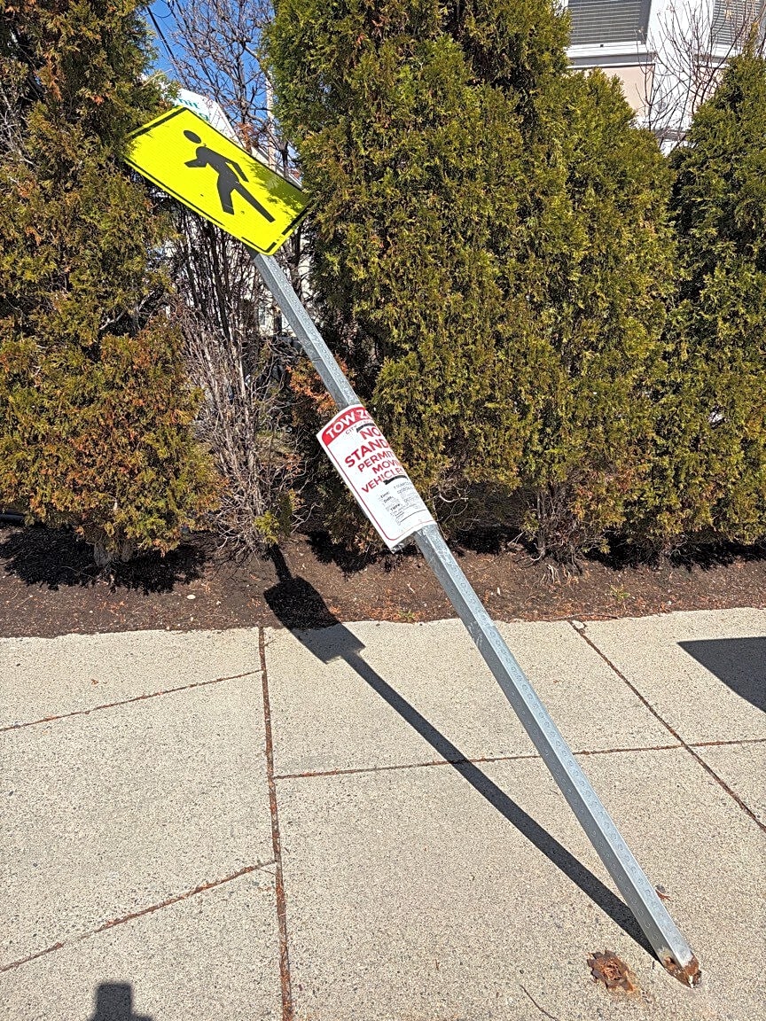 Intersection Of Eulita Ter And Union St, Brighton, MaA crossing sign embedded in the sidewalk is knocked down & leaning into the bushes, blocking the sidewalk