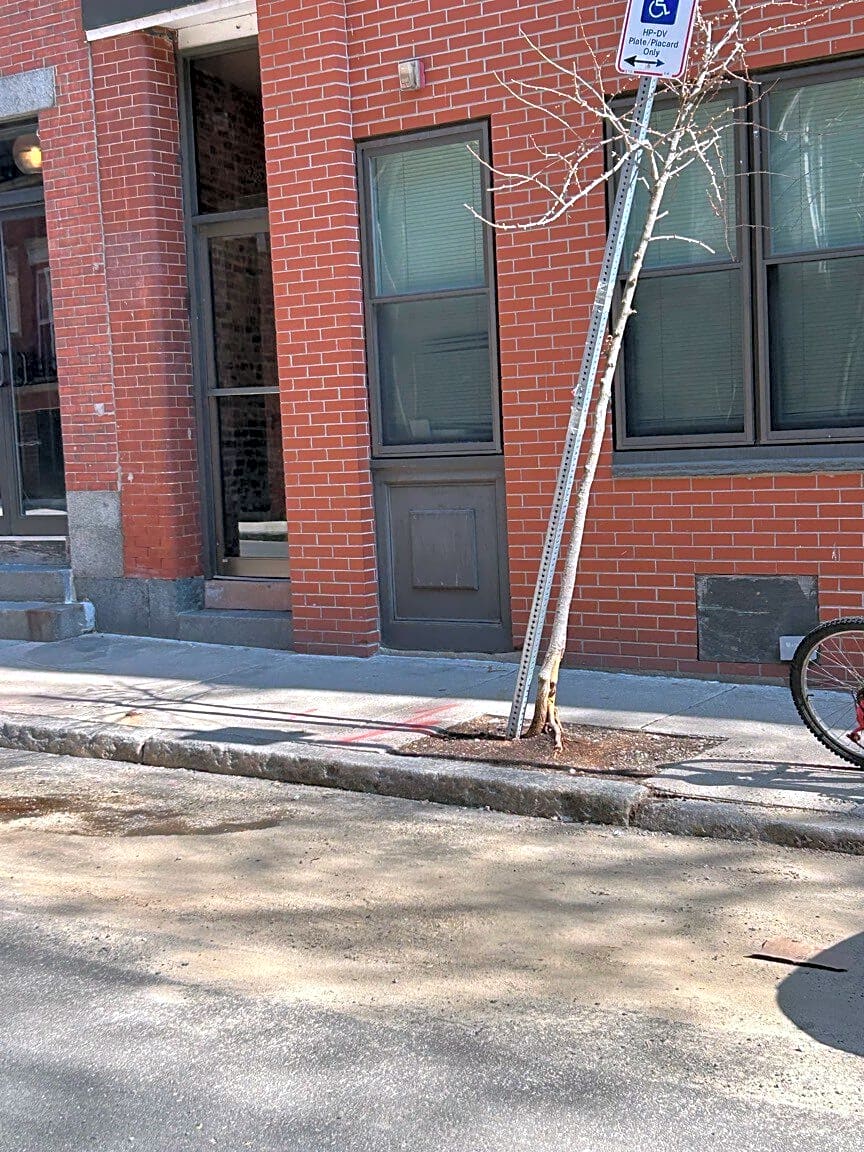25 Charter St, Boston, Ma, 02113Broken handicap parking sign on charter Street. someone stuck it in the dirt next to a tree.