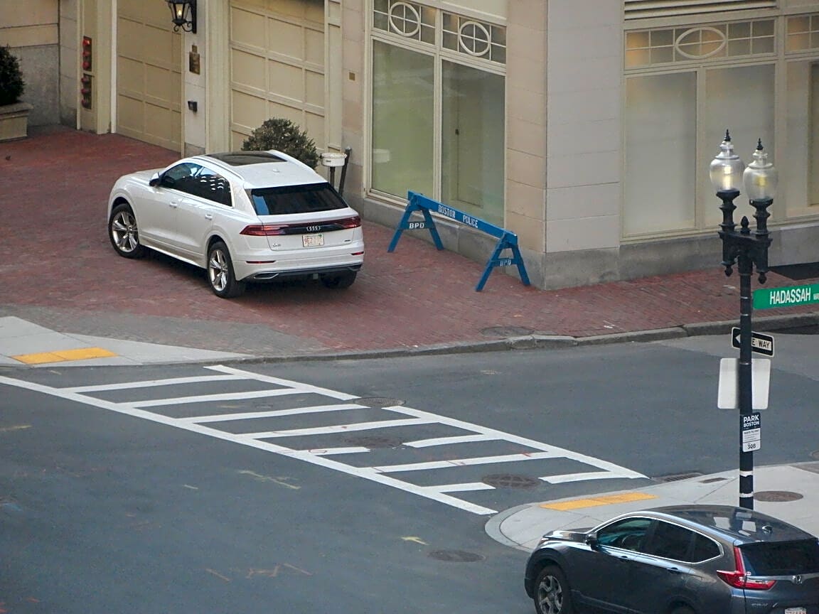 Intersection Of Hadassah Way And Park Plz, Boston, MaA Police barricade, from the Marathon, is still out on the corner of the Le Jardin Condo. Thank you