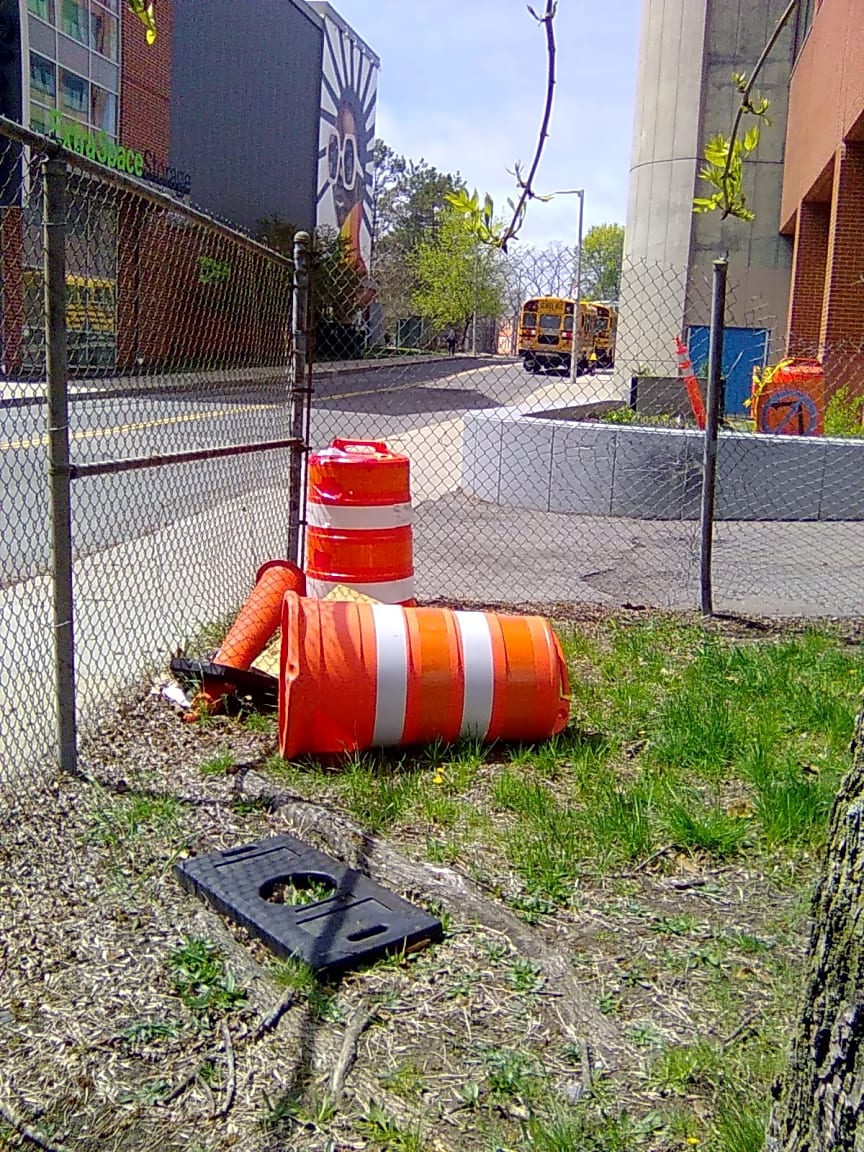 Mcbride St & Rossmore RdClean up discarded traffic barrels, cones, and other debris left my English Hight construction workers. They have stopped working and are now leaving these items on the Athletic Field!
