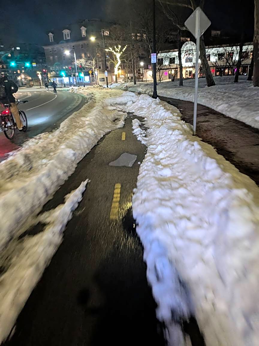 Intersection Of Atlantic Ave And Commercial Whf E And Commercial Whf W, Boston, MaUnplowed section in the bike lane along the park.
