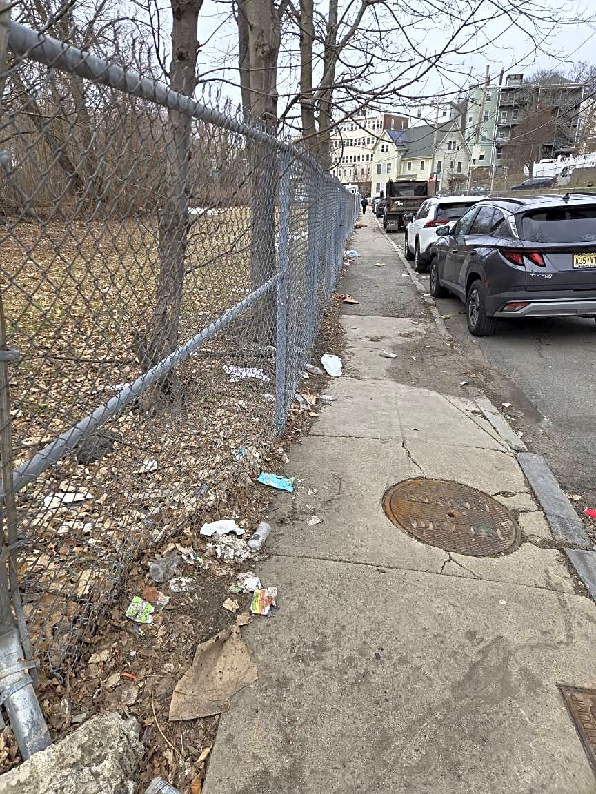 Intersection Of Thornton St And Valentine St, Roxbury, MaTrash and litter on sidewalk and street. Please have DPW clean up.