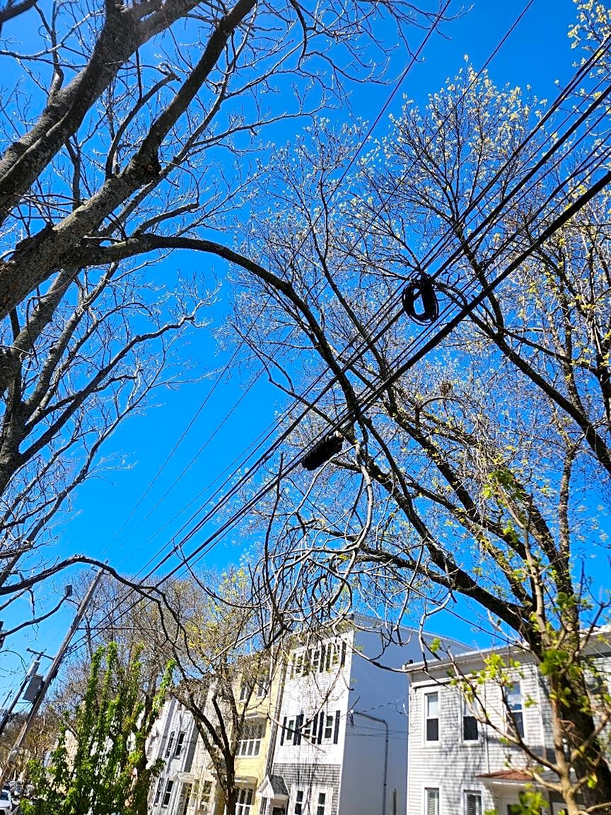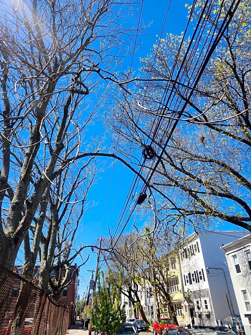 Belmont Pl & Everett StTree limb resting on wires on Everett Street east boston between cottage and lamson Street, behind catholic church on summer