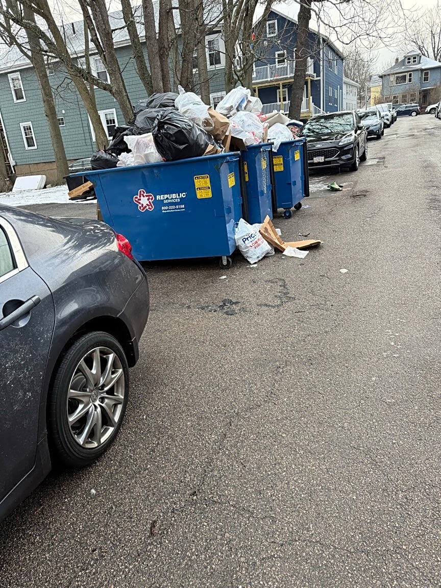 Over flowing trash and dumpsters on street for weeks. 2 Miles Street