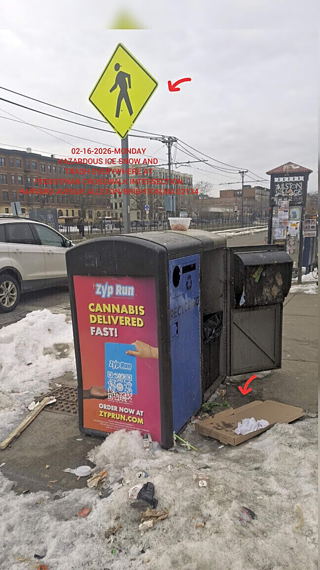 1277 Commonwealth Ave, Allston, Ma, 02134There is dangerous amounts snow and ice waste all through out this pedestrian crosswalk intersection located between 1277 COMMONWEALTH AVENUE AND HARVARD AVENUE IN ALLSTON,MA 02134 by the 66 M.B.T.A. bus stop and 7-11 grocery store and five guys restaurant all the way up the street to the nail salon. This could lead to further injuries as I have small children in my family in baby strollers who could not walk through the area with out getting injured. .I was harrassed and threatened by racists for having my phone to report these hazards during this dangerous winter weather.I am a person of color.Please salt and shovel the area. Thank You,Gracias. 02-16-2026-MONDAY https://www.mbta.com/schedules/66/line https://www.google.com/maps/place/7-Eleven,+1227+Commonwealth+Ave,+Allston,+MA+02134,+United+States/@42.3499849,-71.1319928,17z/data=!4m6!3m5!1s0x89e379c5df9cc52f:0x33fe50cbf1722f9c!8m2!3d42.3505092!4d-71.1314366!16s%2Fg%2F11c2pm5k5l?g_ep=Eg1tbF8yMDI2MDIxMV8wIJvbDyoASAJQAQ%3D%3D