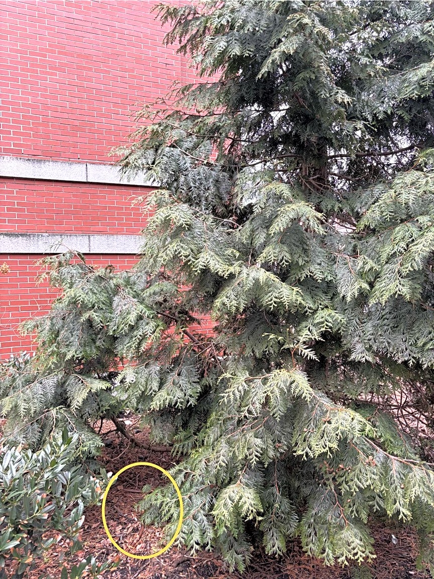 Needle found to the left of the large tree in the mulch area along Carleton St