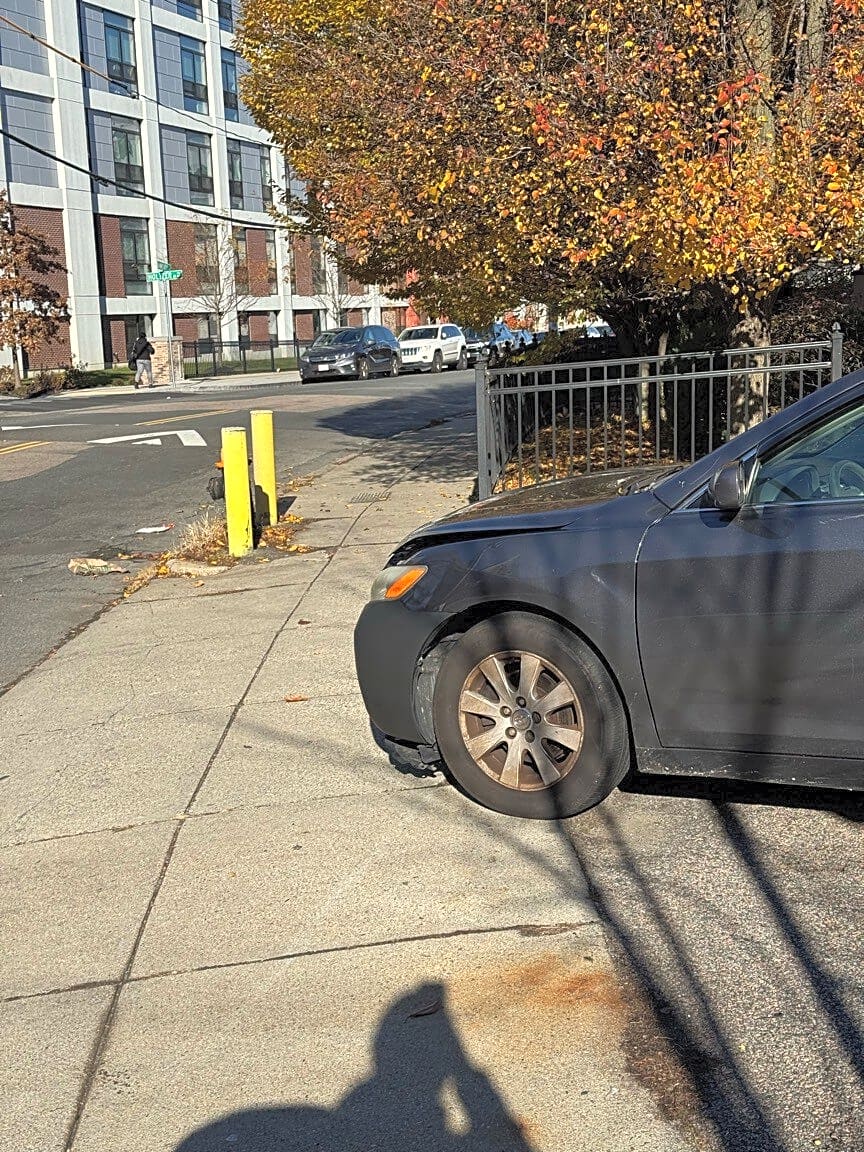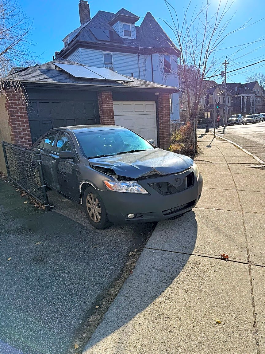 150 Amory St, Roxbury, Ma, 02119Car with no plates is partially blocking side walk. Has been like this for weeks.