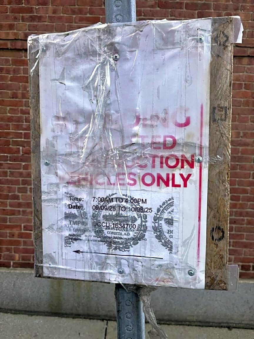 Intersection Of Back St And Dartmouth St, Boston, MaRE-OPENING closed case # 101006508931. EXPIRED SIGNAGE. This 311 Case was was closed prematurely as there is still a bolted sign, 1/2 way down a pole on Dartmouth St (between Back Street and Beacon Street) Original Case Info: Expired and severely outdated construction signage on Dartmouth St between Beacon Street and Back Street (close to Storrow Drive area). The sign is on Dartmouth St, but it is related to old construction (Fall 2025) for 234 Beacon Street as it is a corner building (Beacon at Dartmouth).The sign is physically mounted with nails and we are unable to remove. Please remove ASAP as this sign is causing parking confusion unnecessarily. There also may be an orange come on the ground that is no longer needed. See updated picture with sign circle behind the car in view. CLOSED 2w ago #101006508931