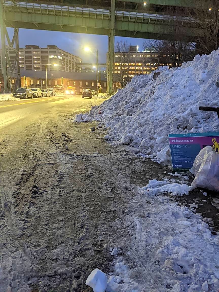 Snow has been liked up onto the sidewalk blocking the path. Anyone walking to the navy yard, the MGH shuttle or kids going to Charlestown high have to walk in the street.
