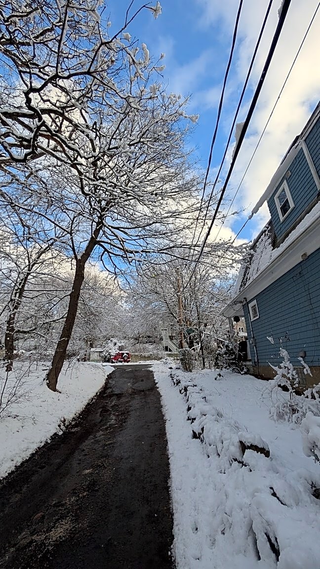 241 Cottage Rd, Boston, MA 02132city tree branch resting on power line heavy with snow on 1/20/2026. Also - same branch rubbing on my roof.