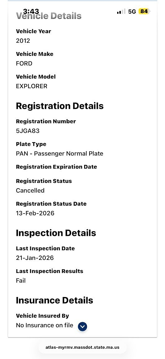 41 61 Beechland Cir, Roslindale, Ma, 02131Abandoned vehicle with rejected inspection sticker and failed and false registration.