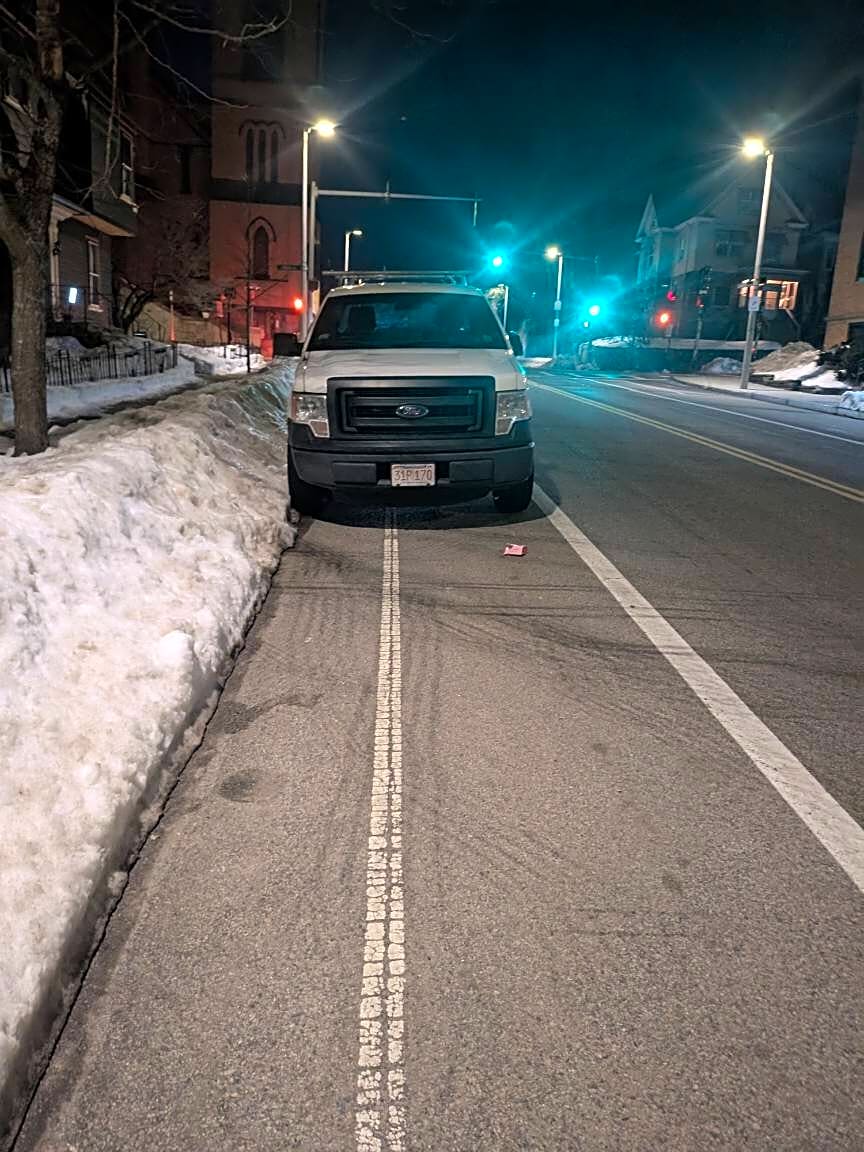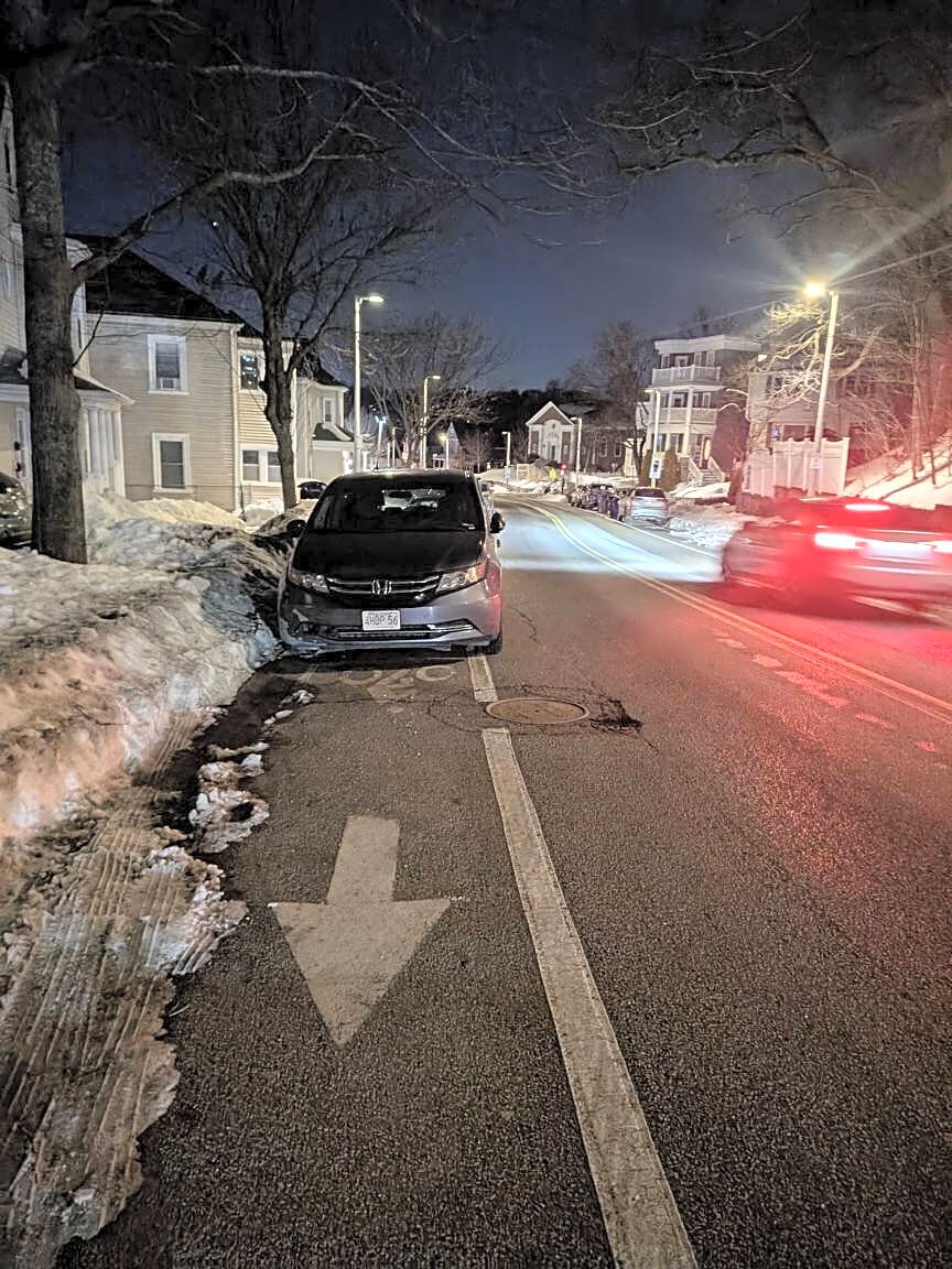 195 Cummins Hwy, Roslindale, Ma, 02131Vehicle parked partially in the bike lane instead of shoveling out the parking space.