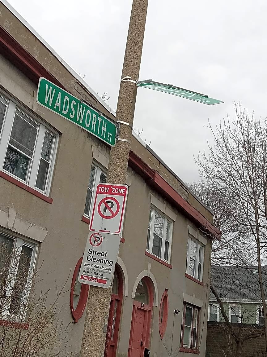 Intersection Of Hartley Ter And Wadsworth St, Allston, MaHartley Terrace sign is about to fall down.