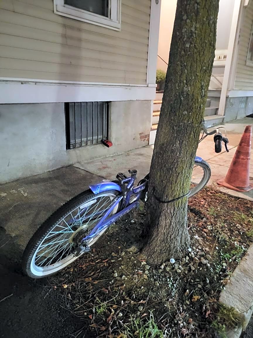 296 E Eighth St, South Boston, Ma, 02127Abandoned bicycle still on this tree at 296 E 8th Street