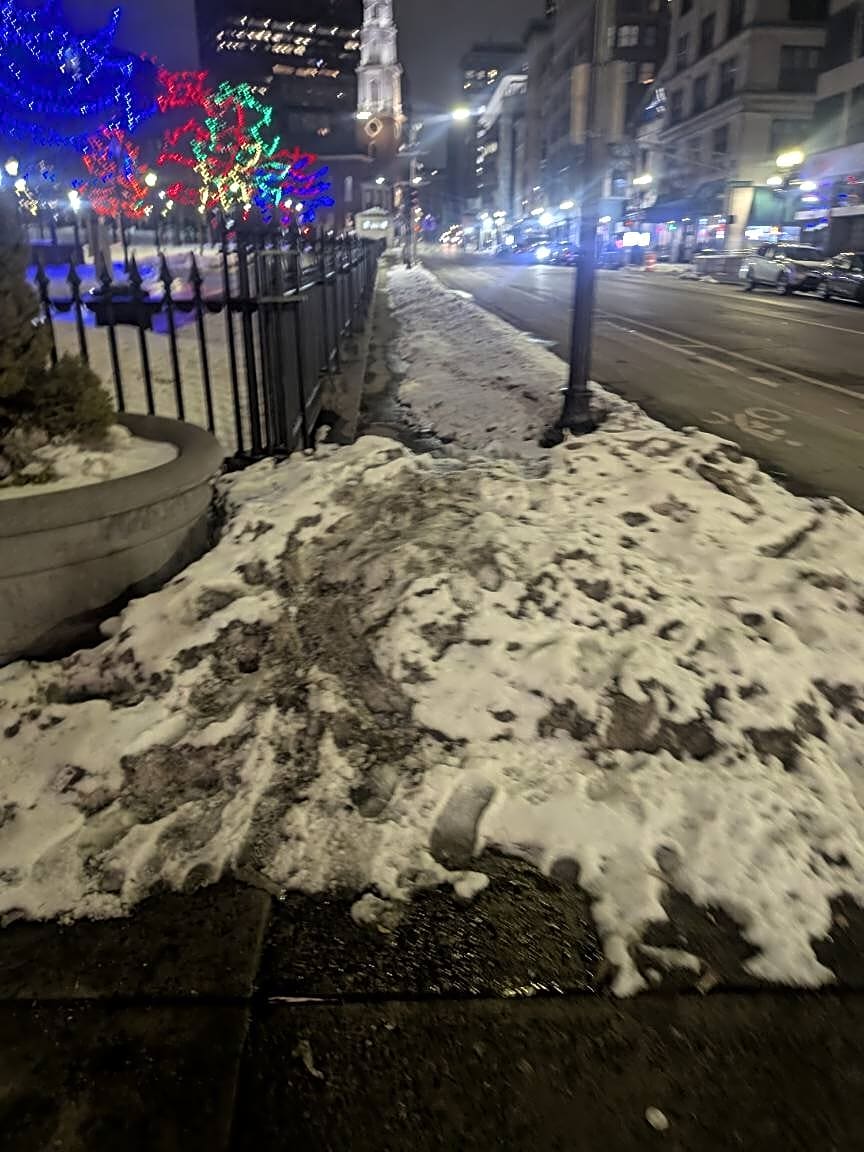 Intersection Of Winter St And Tremont St, Boston, MaBig snow pile blocking the sidewalk AND preventing bailing to the street. I had to climb over this in heels!!