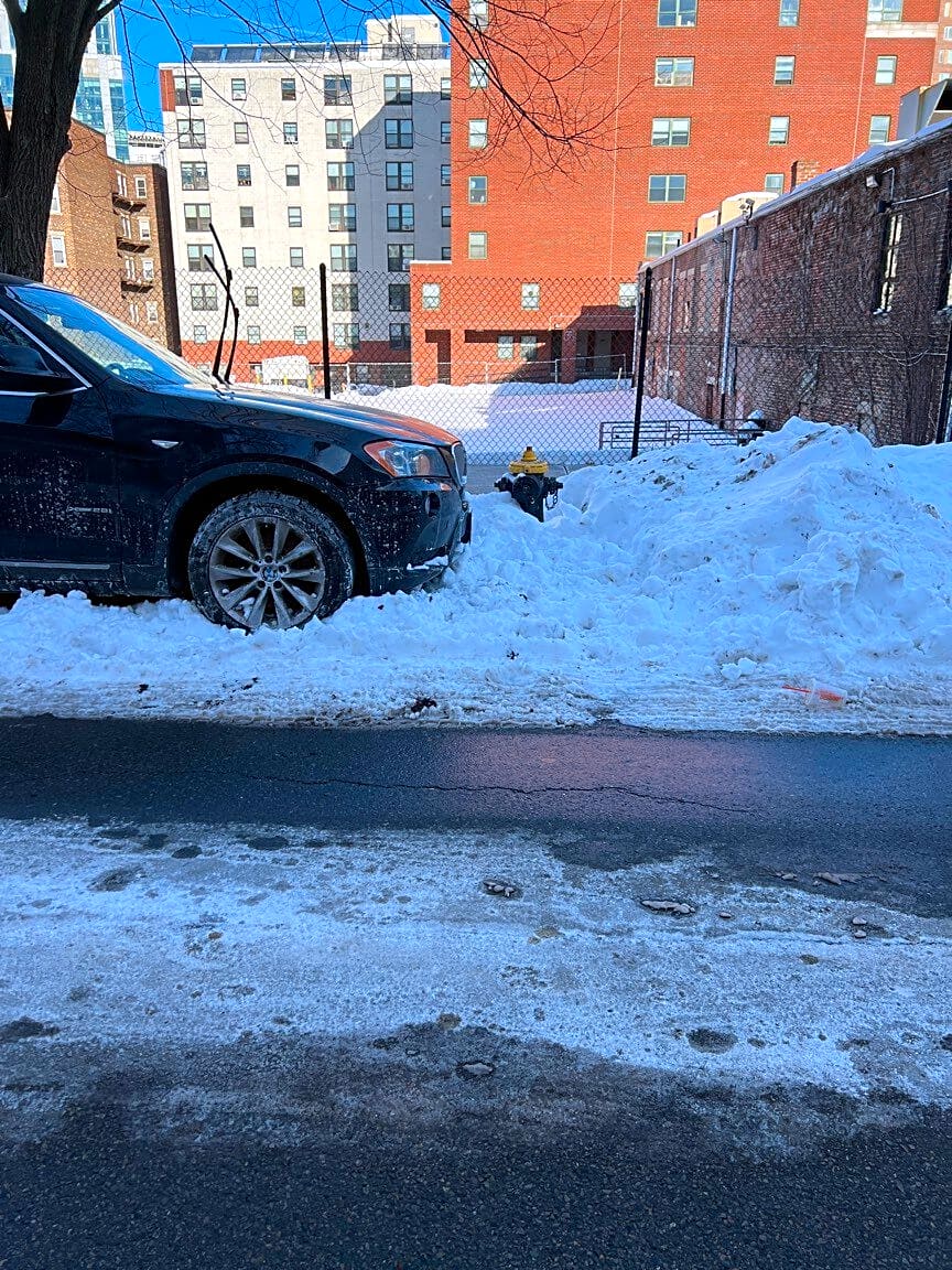 95 101 Queensberry St, Boston, Ma, 02215Car with license plate 5BSF76 parked right in front of a fire hydrant (which has not been shoveled out) in front of 98 Queensberry