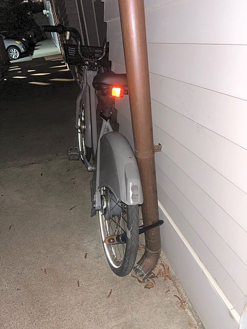 Stolen blue bike locked to an external pipe on the left side alley of our building