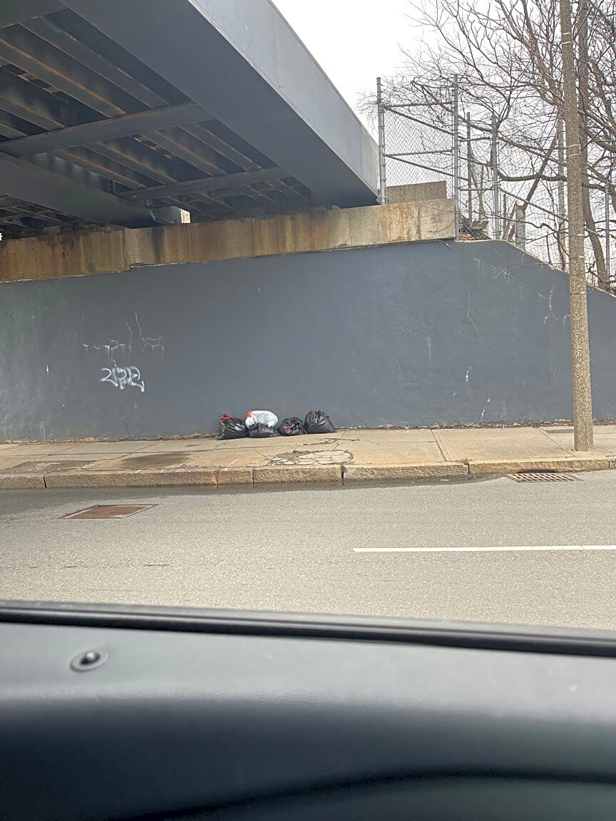 Intersection Of Southampton St And Allstate Rd, South Boston, MaBags on Southampton under overpass on sidewalk.