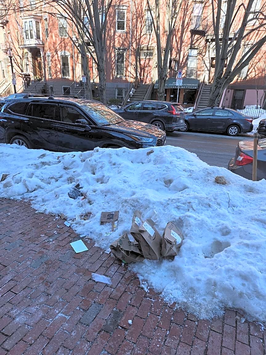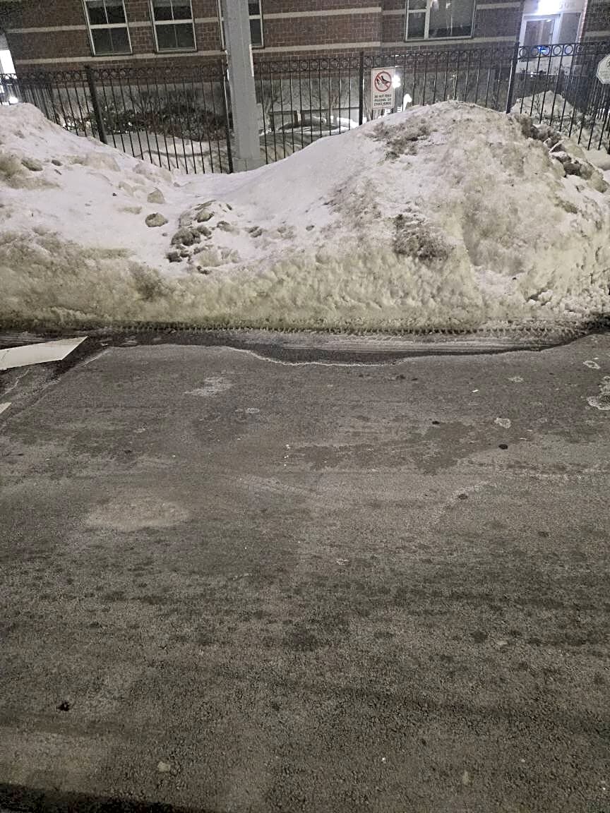 Pleasant St in Dorchester still dealing with numerous lost parking spaces due to piles of icy snow that were created because the City never enforced the snow emergency rules of ticketing & towing. Cars were simply left on the street. Not the first time from east Cottage to Dot Block
