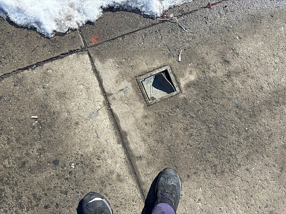 Water cover is bent and a tripping hazard on the sidewalk in front of Flames 1 Peabody Square Dorchester Center