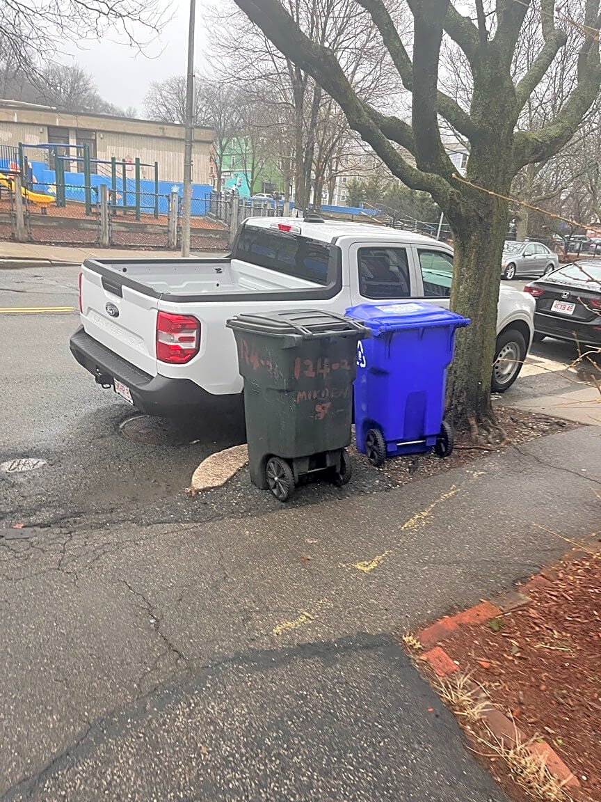 130 Minden St, Jamaica Plain, Ma, 02130Construction vehicles parking illegally every day, parked across driveway and crosswalk at a school