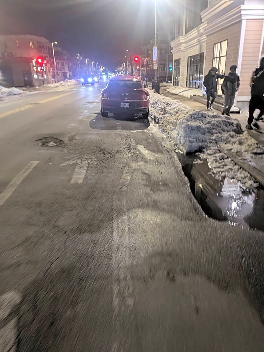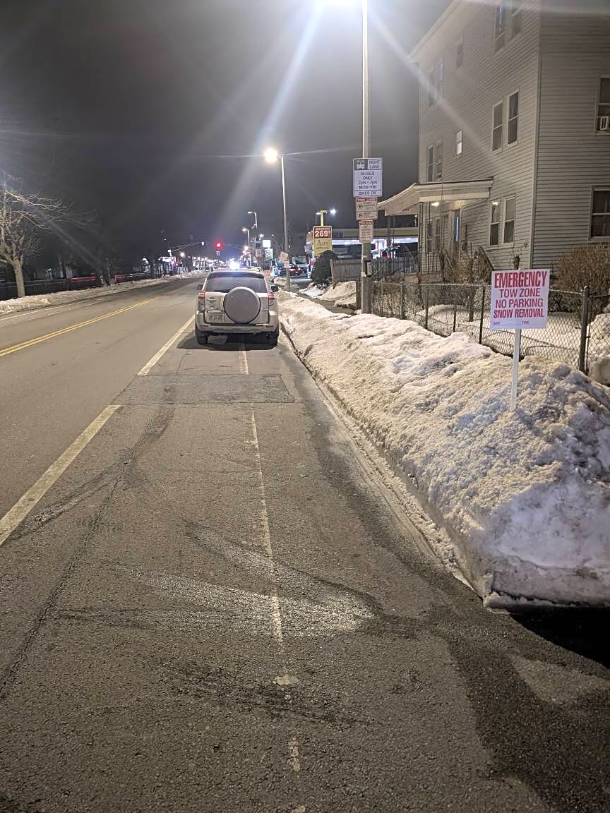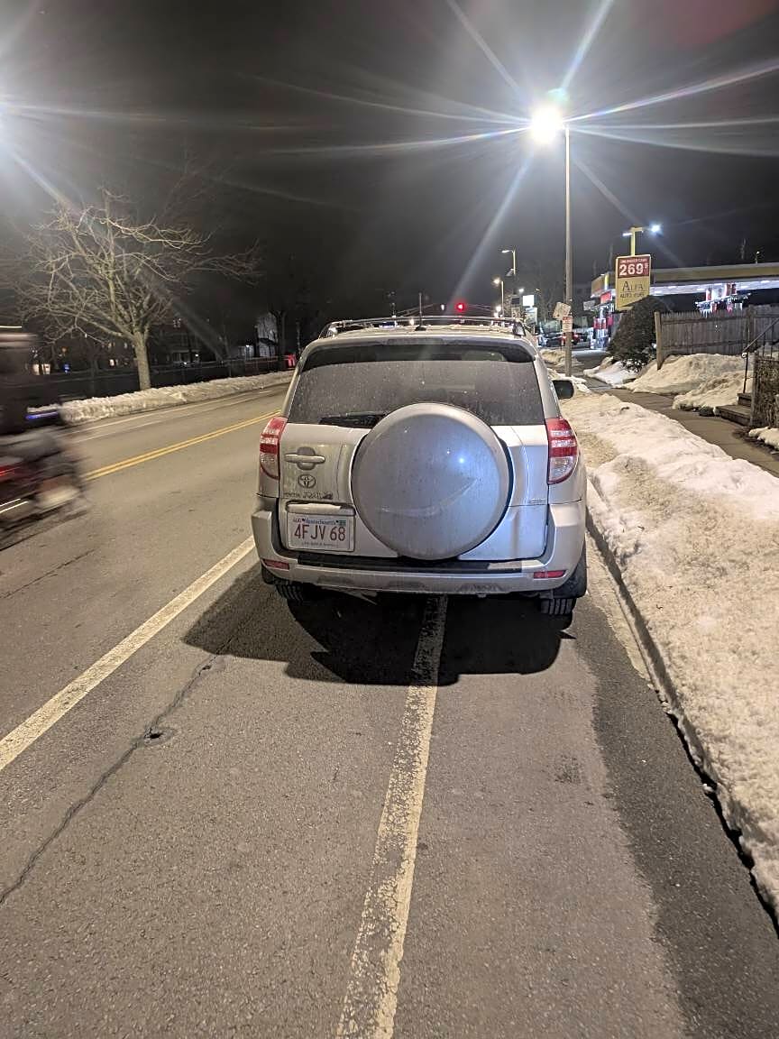 4077 Washington St, Roslindale, Ma, 02131Vehicle parked partially in the bike lane instead of shoveling out the parking space.