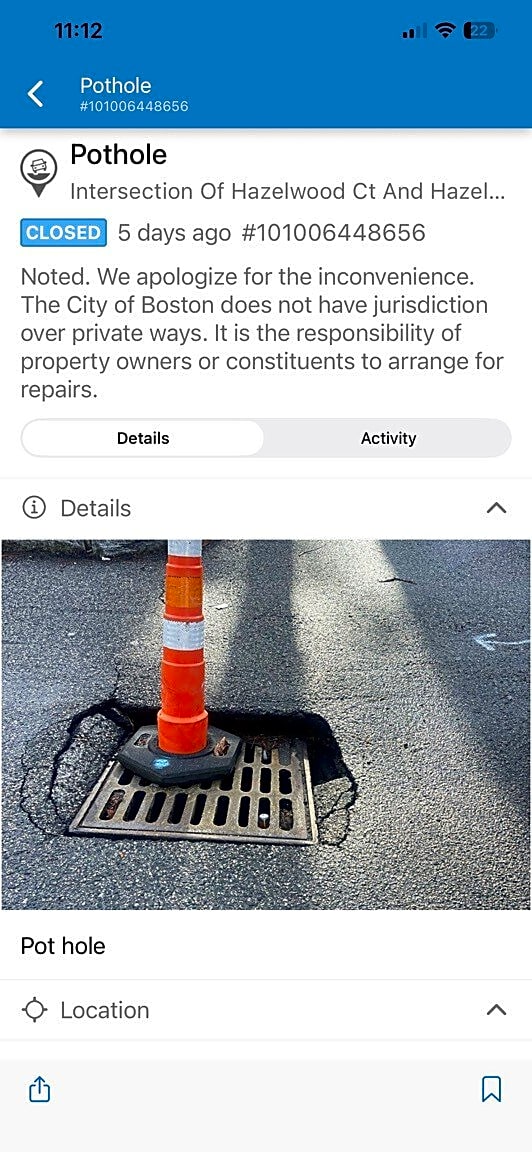 Intersection Of Hazelwood Ct And Hazelwood St, Roxbury, MaResponding to a previous report for a pothole on a public way. The location of the pothole previously reported #101006448656 is on a public way and is not private property.
