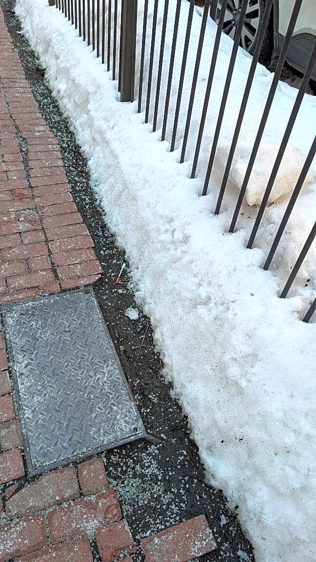 Needle on sidewalk on Fay street near opening of gate to parking lot