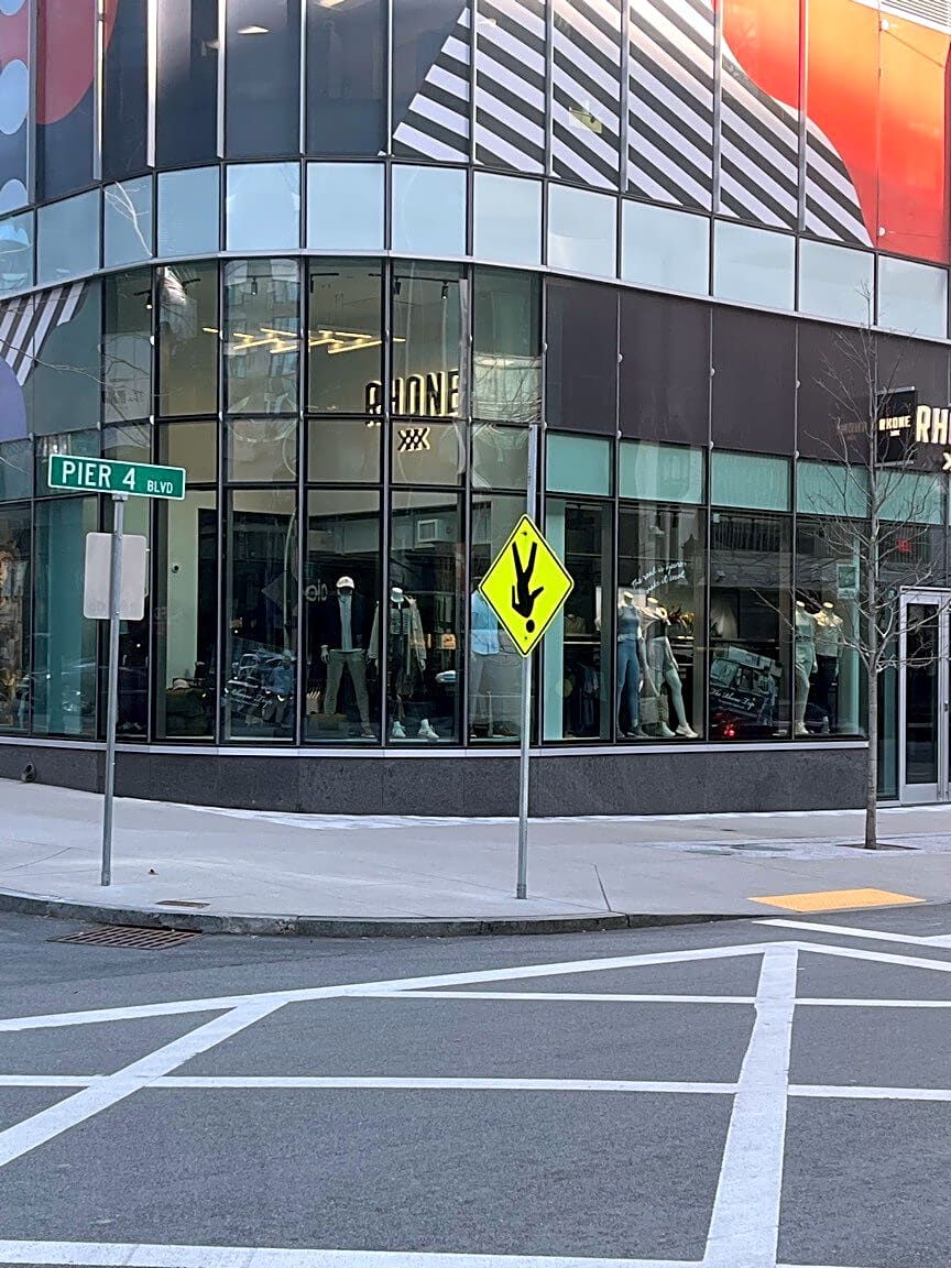 43 61 Pier 4 Blvd, Boston, Ma, 02210Loose crosswalk sign hanging upside down.