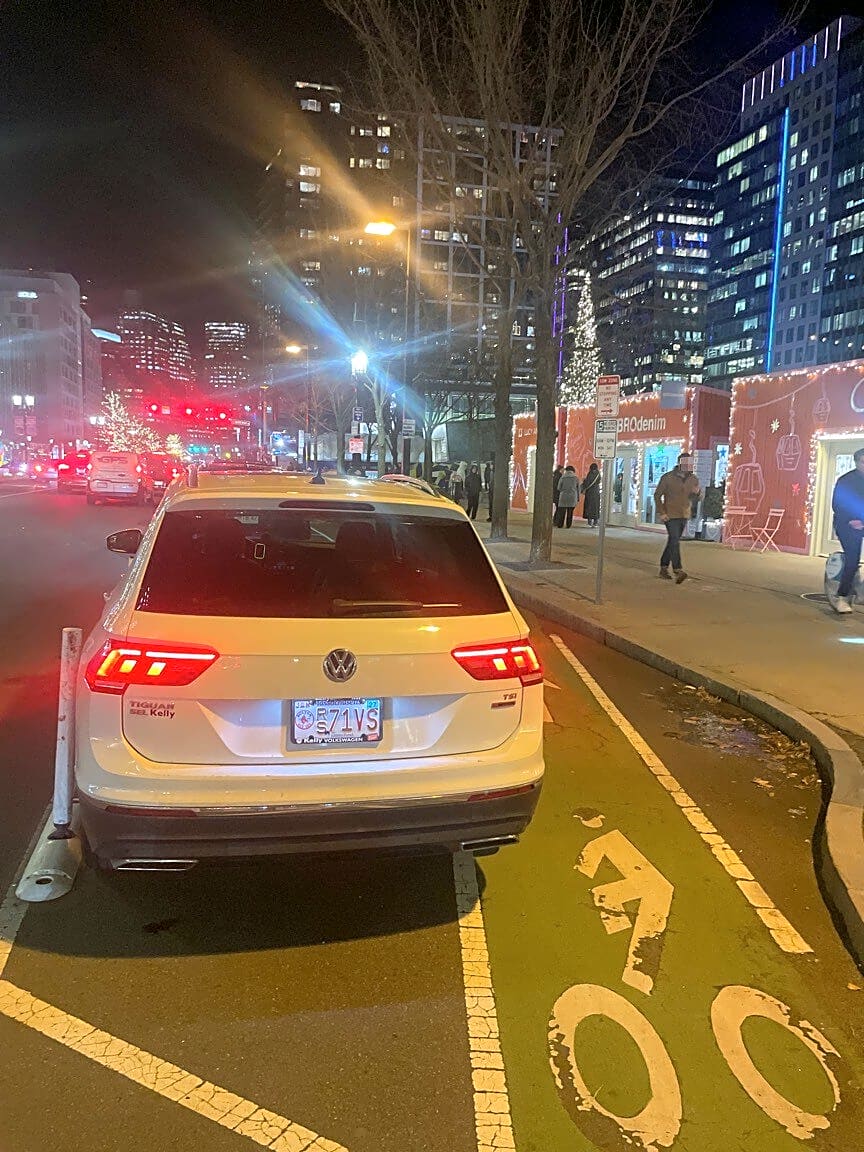 Intersection Of Intervale St And Columbia Rd, Dorchester, MaWhite sedan illegally parked blocking the crosswalk