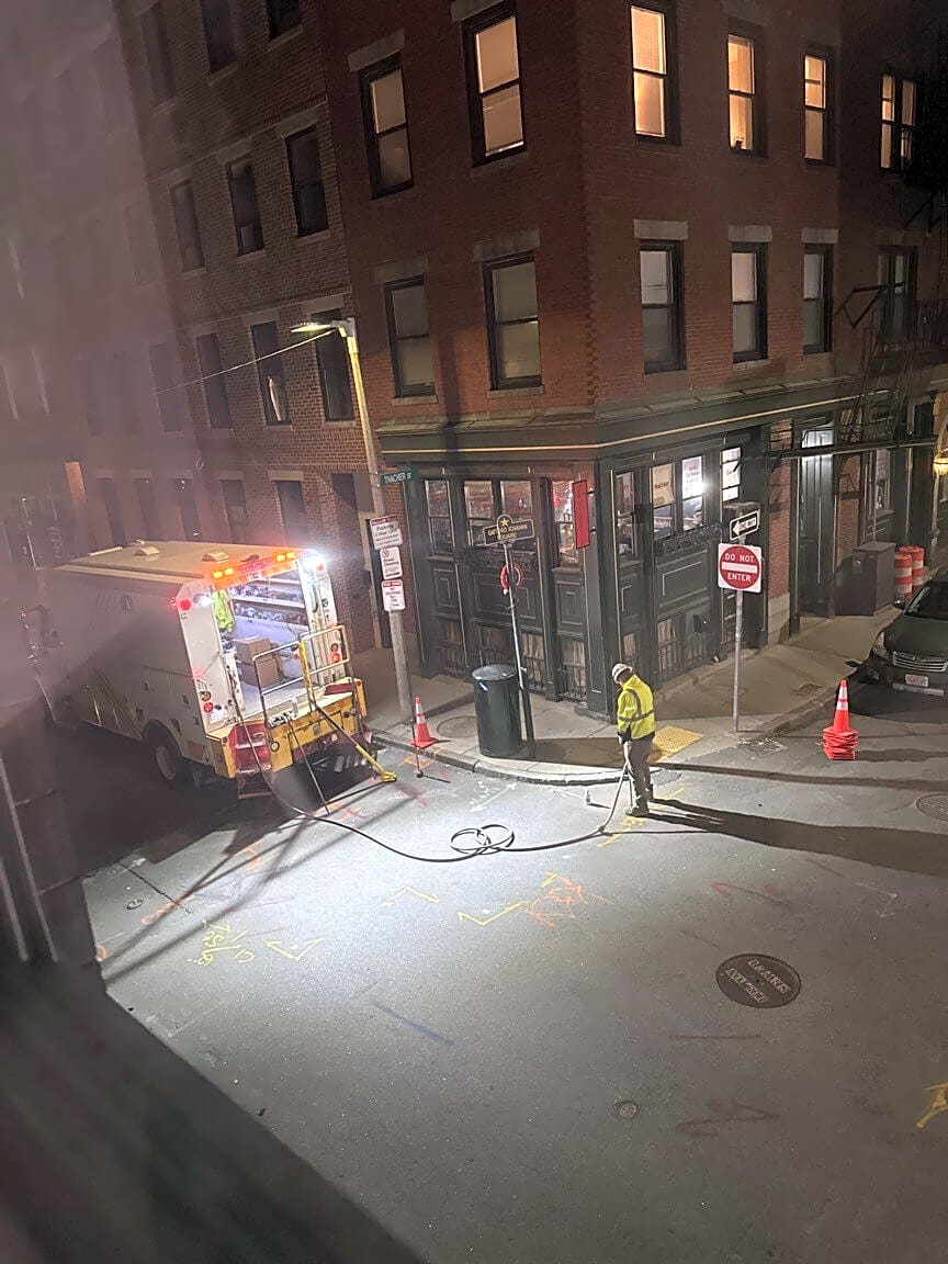 Intersection Of Prince St And Snow Hill St, Boston, MaNational Grid jackhammering 930pm