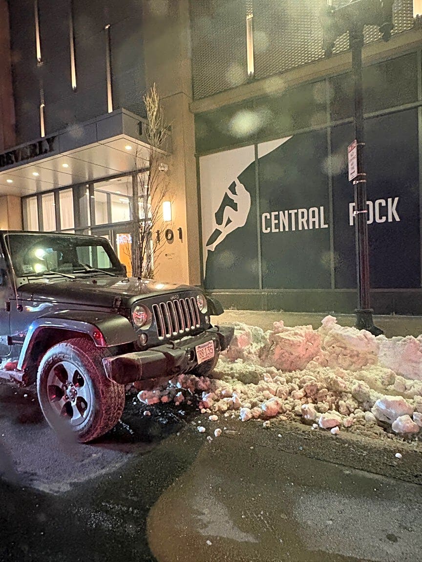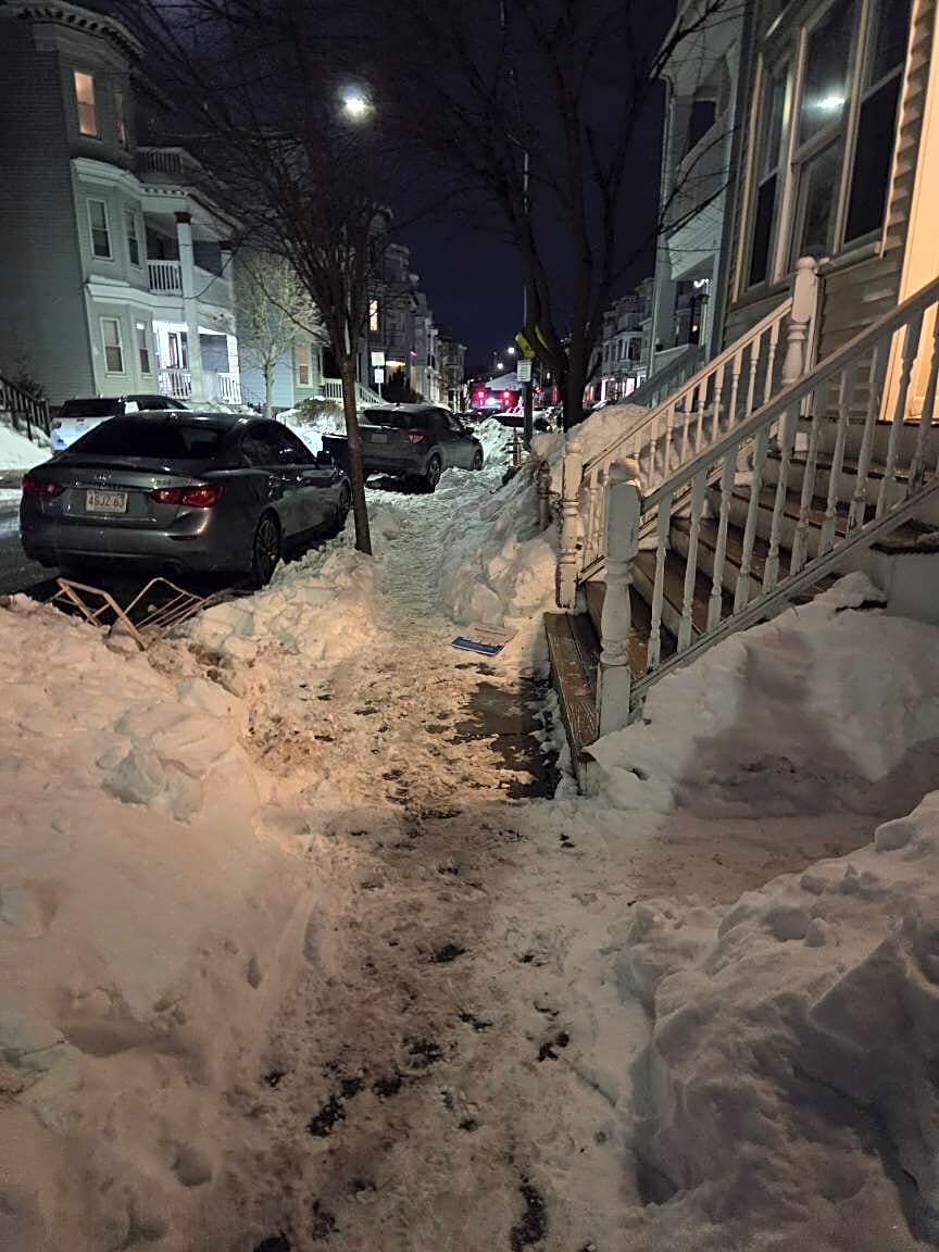 Intersection Of Palace Rd And Fenway, Boston, MaSnow pile at crosswalk. Hard to see around it. It’s over 6 feet. This is a cross walk area for the back of Boston Latin School.
