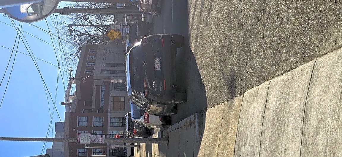 Intersection Of P St And E Fifth St, South Boston, MaCar parked in bus stop with fake resident parking sticker. Same car that was there for 4 days without a ticket! Either ticket vehicle or let residents park here!
