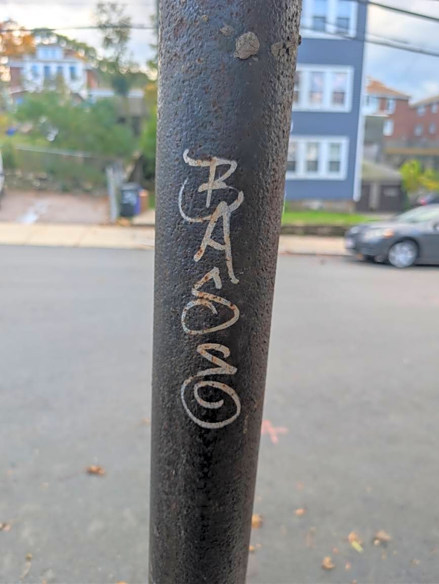Graffiti on Nantasket Ave/Union St sign pole in Brighton.