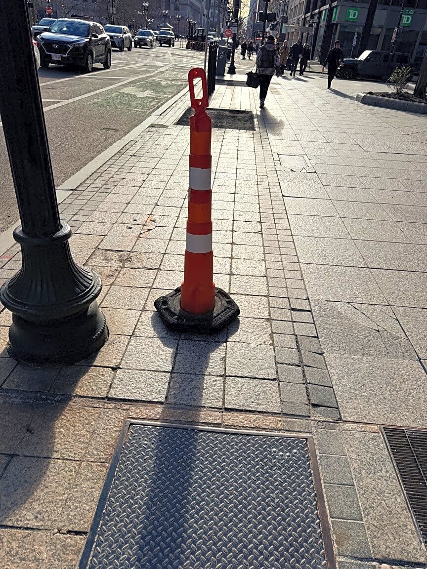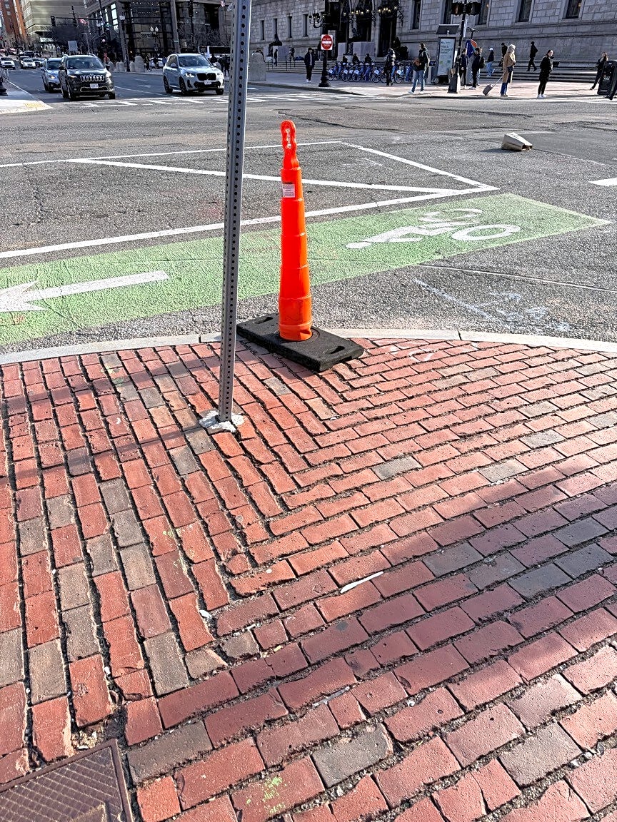 Intersection Of Dartmouth St And Boylston St, Boston, MaRandom cone obstructing pedestrian way. Please cite if necessary and remove.