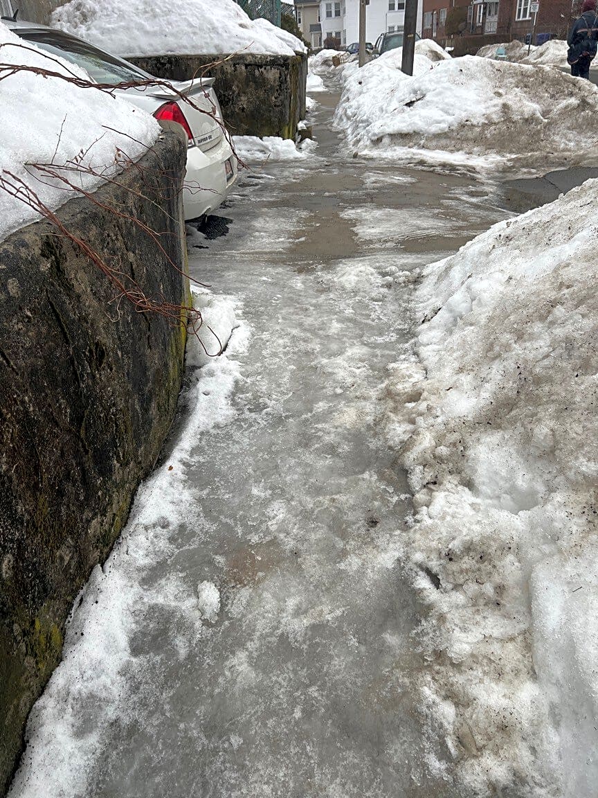 Intersection Of Oliver St And Seaport Blvd And Atlantic Ave, Boston, MaLarge pothole very dangerous and have to drive through it because snow blocking the correct way