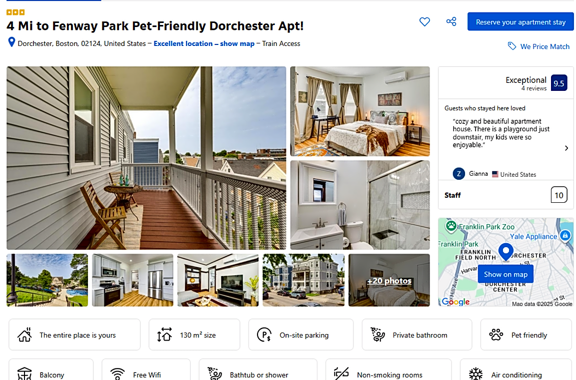 58 Claybourne St, Dorchester, Ma, 02124Short term rental violation. 58 Claybourne St is a three family building with a single owner. The owner has not filed a residential exemption. The entire building is offered as a short term rental with year-round availability at https://www.booking.com/hotel/us/4-mi-to-fenway-park-pet-friendly-dorchester-apt.html (the address is not disclosed in the listing, but can be identified from the photos of the exterior).