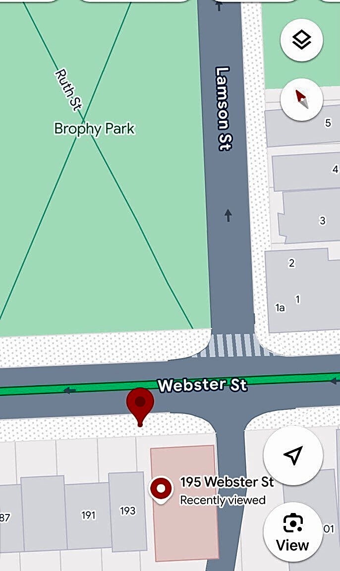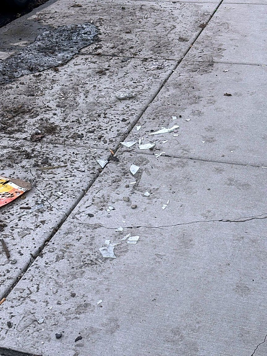 195 197 R Webster St, East Boston, Ma, 02128Broken glass on sidewalk across the street from Brophy Park, between 195 and 197 Webster street East Boston MA 02128