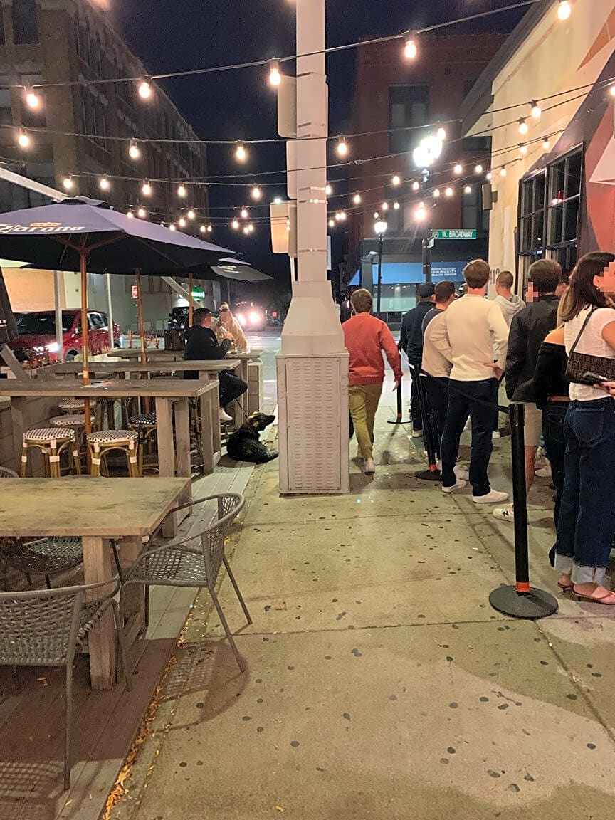the sidewalk is inaccessible at Loco F and Broadway with the line and light pole