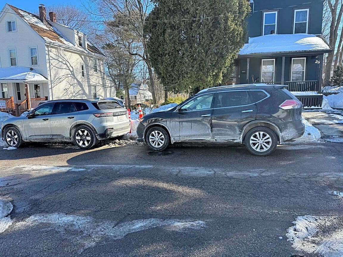 Intersection Of Sycamore St And Wilkins Pl, Roslindale, MaTwo SUVs illegally parked between no parking signs, making entry and exit to dead end Road difficult. 1:35 pm 2/3