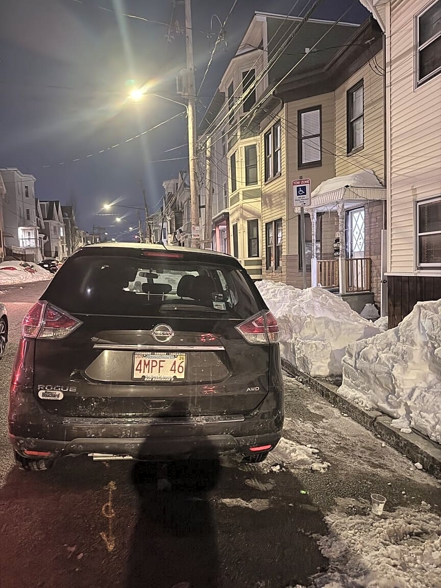 160 Falcon St, East Boston, Ma, 02128Car parked on Falcon Street in a handicap spot with fraudulent placard. The placard in the vehicle does not belong to the owner of the vehicle. The photo on the placard is also intentionally covered up. Car is parked approximately 36 inches from the curb posing a hazard to the passing of emergency vehicles.