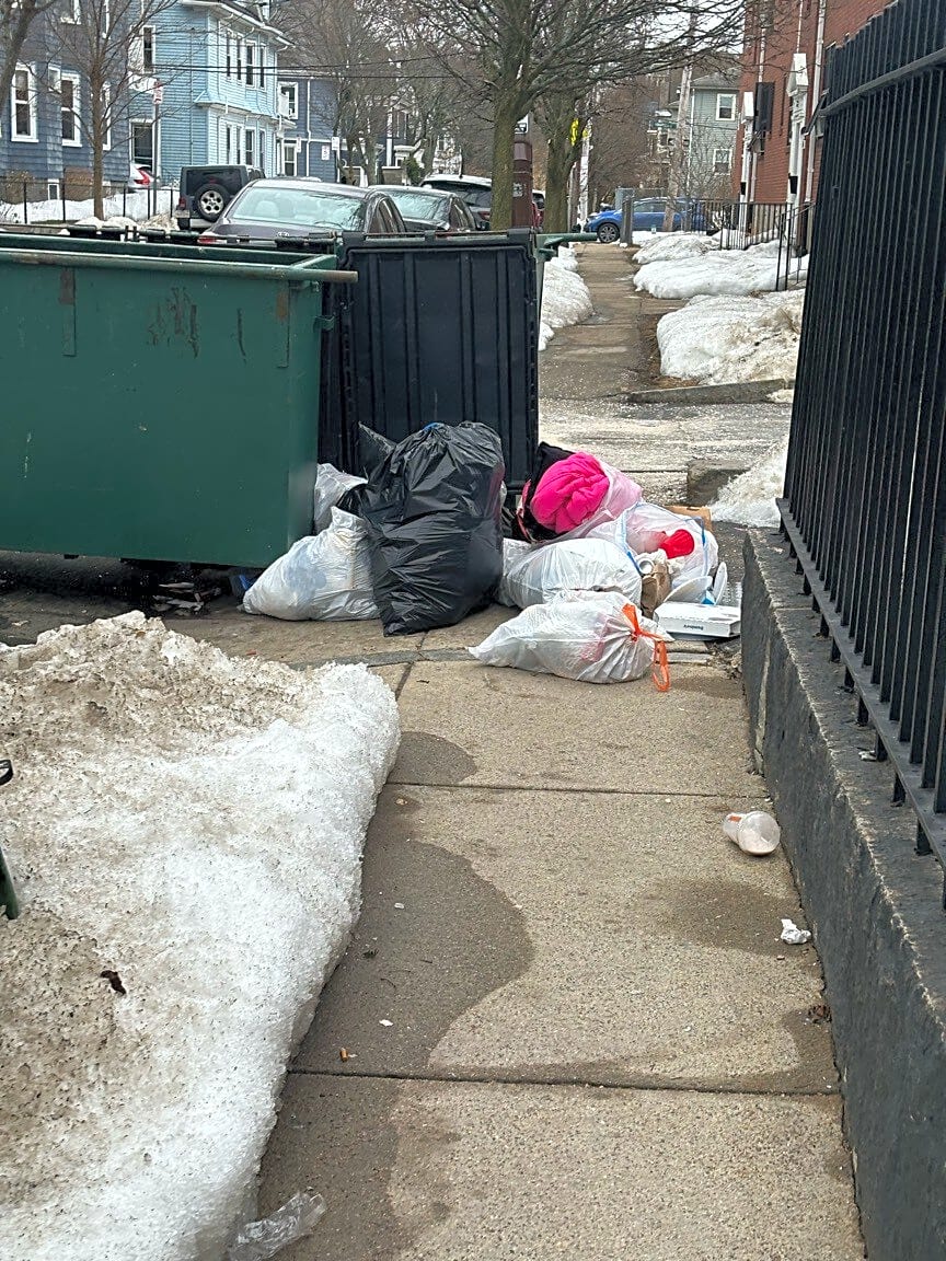 This is what the street looked like AFTER the trash truck came. Dumpsters emptied but surrounding trash left. This address is a chronic trash problem.