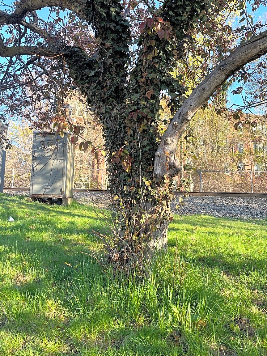 777 South St, Boston, MA 02131Crab apple being strangled by Ivy. It’s on the grass right by the commuter rail station on the Roslindale Village side.