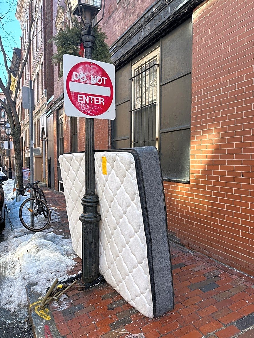 Intersection Of River St And Public Alley No. 301 And Mount Vernon Sq, Boston, MaTrash left out 48 hours before city trash pick up on Friday morning.