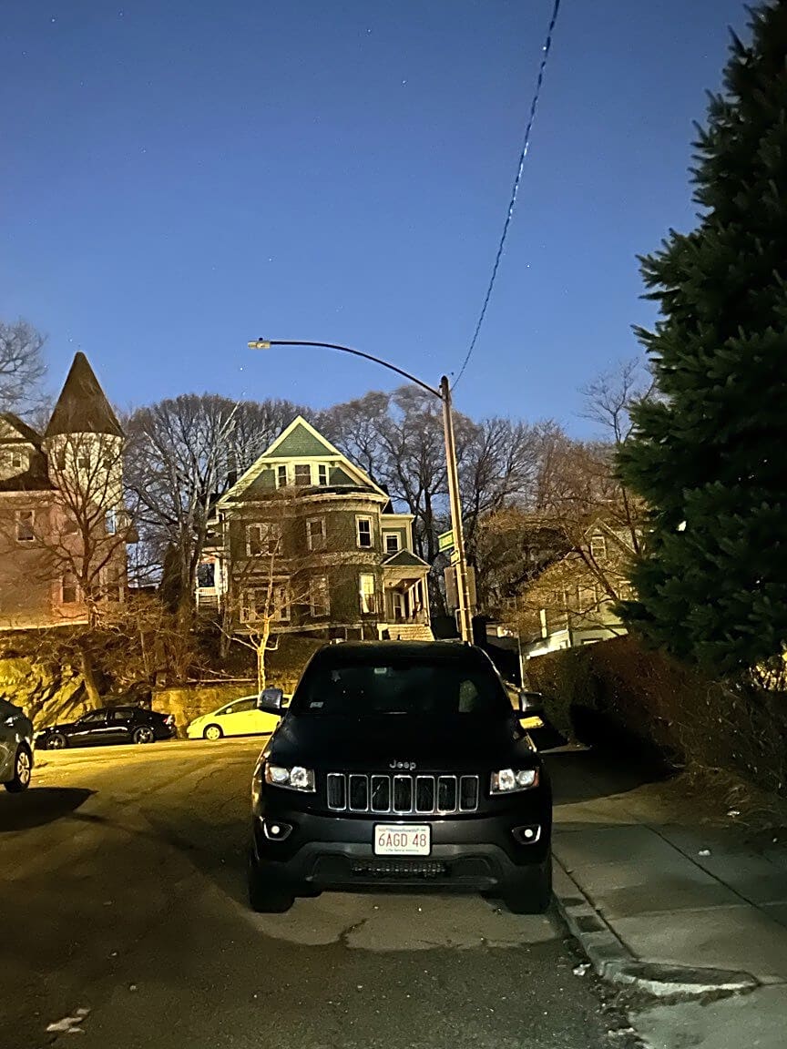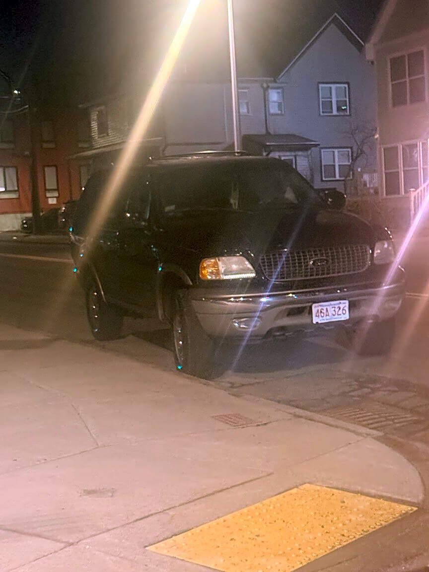 Intersection Of Grantley St And Hyde Park Ave, Hyde Park, MaA car is parked dangerously in the street at 1436 Hyde park Ave in Hyde park.