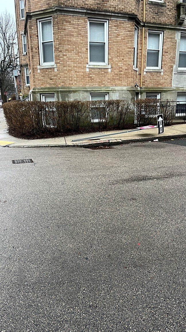 Intersection Of Orkney Rd And Strathmore Rd, Brighton, MaThis sign has been down since the storm in January. It’s a pretty bad trip hazard laying on the sidewalk