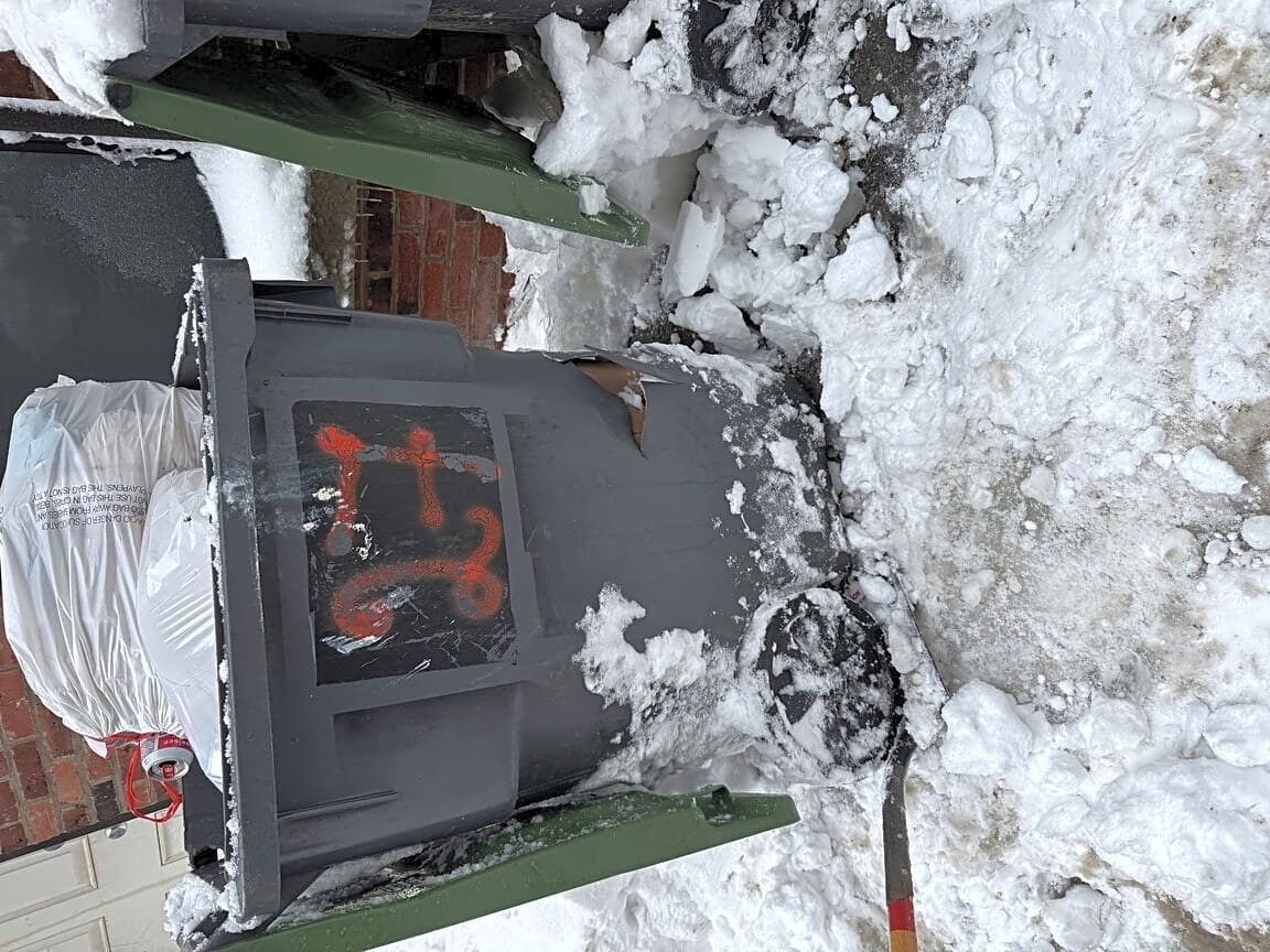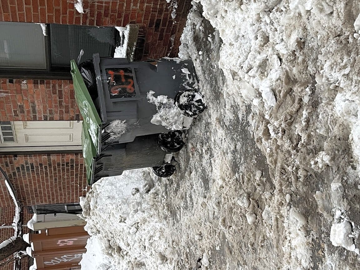 27 Saint Germain St, Boston, Ma, 02115City Snow plows in the alley behind St Germain Street have pushed all the snow to the end of the alley, blocking in parking spaces and also they plowed our trash bins into the snow. This caused the trash to not be picked up, we have cleared the snow around the bins only to find the bins have been completely destroyed by the force of the plows. How can we get new bins?