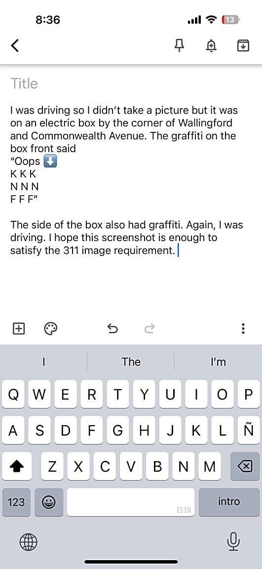 1777 Commonwealth Ave, Brighton, Ma, 02135Graffiti on an electrical box. It appears the graffiti-er was writing KNF vertically three times without realizing what the first horizontal line would read. There’s an arrow point to the “k” line with the word “oops”