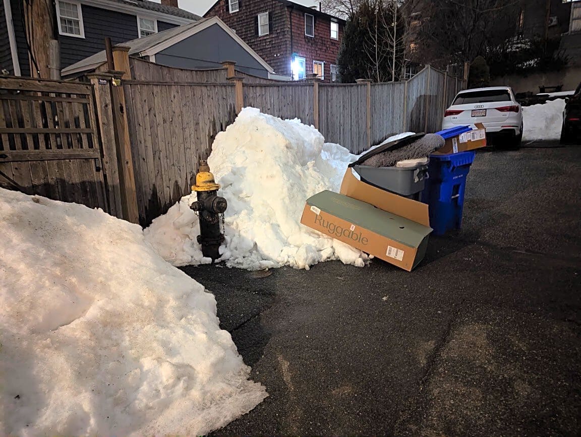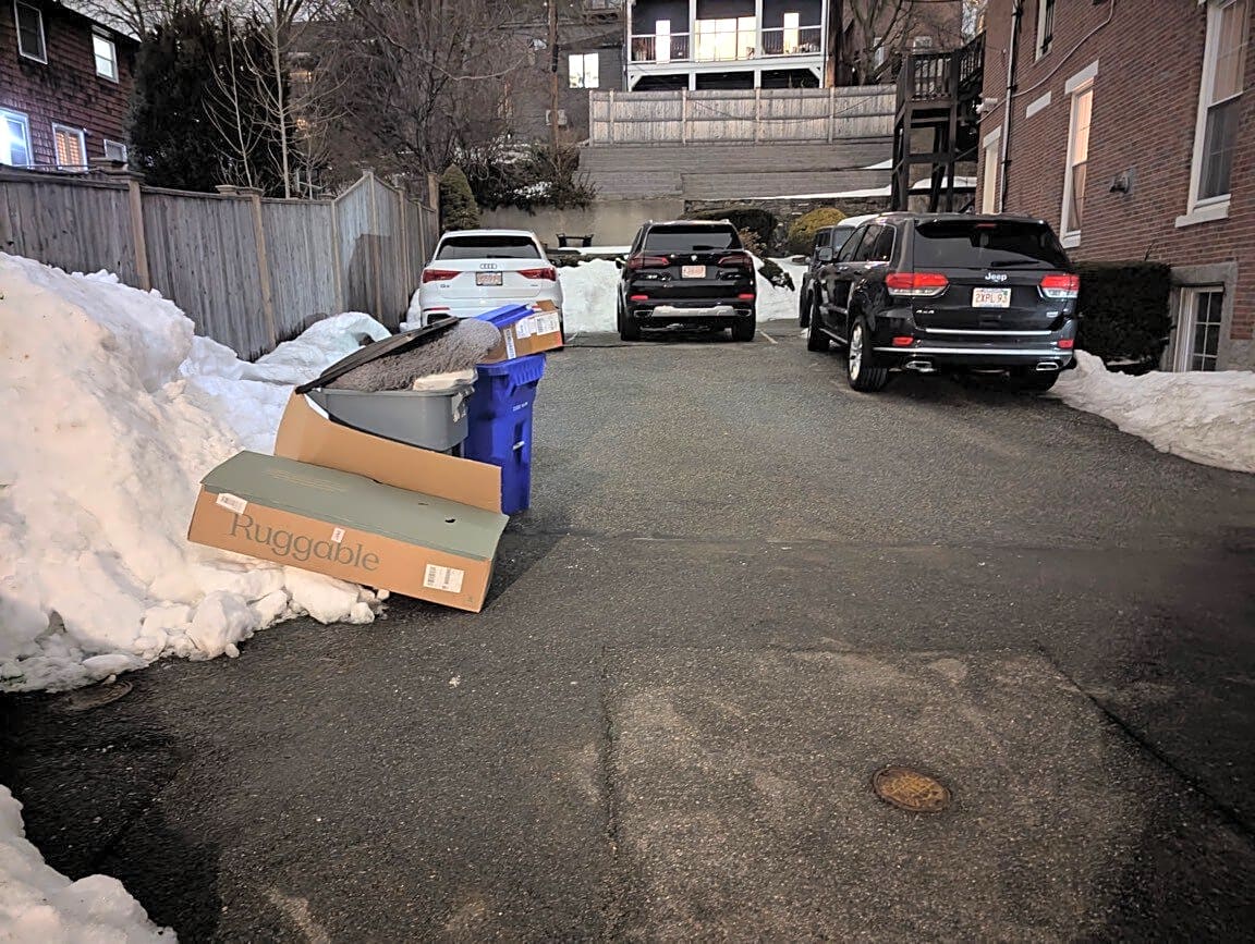 Residents of 223 Main Street placed their trash on Hathon square which is a private way. Their trash is blocking our cars, we can’t get out of our parking lot because it’s blocked by their barrels and loose trash. They need to place their trash on Main Street in front of their residence which is on a public street.